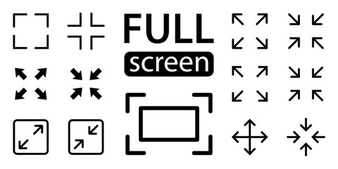 Full screen vector black icons. Set of full screen and exit full screen icon. Arrow mark icons. Scalability icons in flat style for web site, UI, mobile app. Vector illustration
