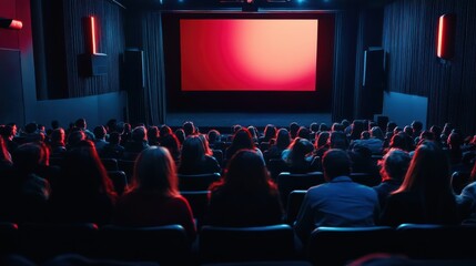 Audience eagerly awaits the start of a movie screening in a dimly lit theater with colorful lights enhancing the atmosphere