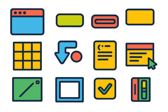 Python GUI Icons. Flat vector icons of Python GUI Programming: tkinter window, button widget, entry box, label element, grid