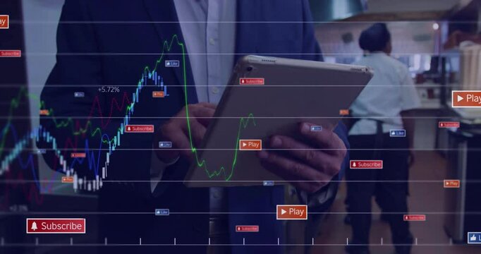 Financial data overlay appearing causing professional man picking smartphone and scrolling charts
