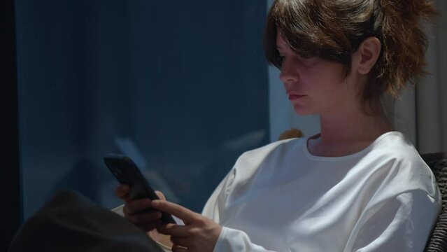 Sleepy exhausted woman lying in bed using smartphone, can not sleep. Insomnia, addiction concept. Sad girl bored in bed scrolling through social networks on mobile phone late at night in dark bedroom.