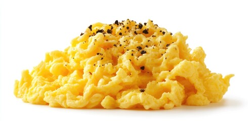 Scrambled eggs, topped with pepper, on a white background