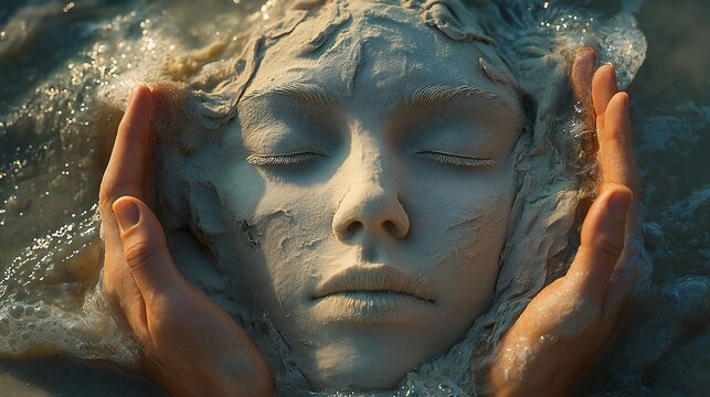 Man sculptor creates sculpt bust human woman sculpture with hammer. Statue craft creation workshop.