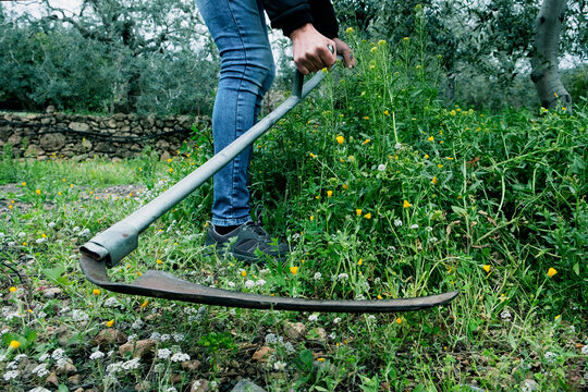 young man mowing the grown grass with a scythe
