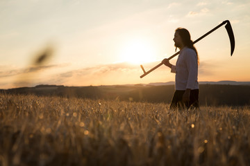 Organic farmer with scythe in barley field at sunrise