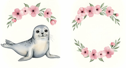 Cute Seal Illustration Surrounded by Flowers for Childrens Themes
