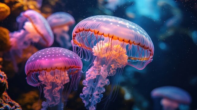Jellyfish in aquarium exhibit, glowing vibrant colors