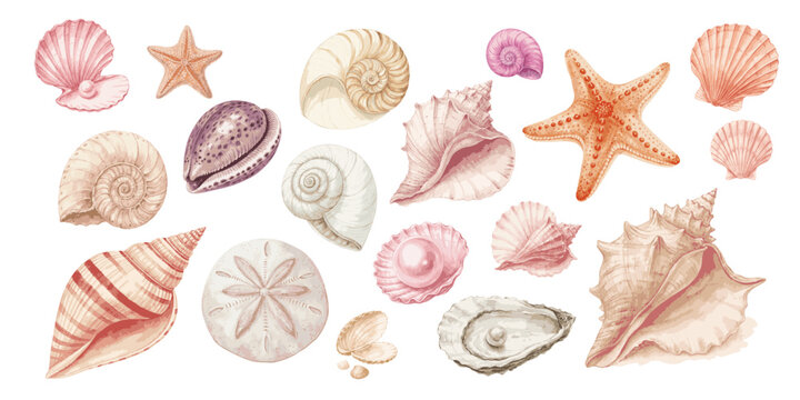 Watercolor seashell collection featuring starfish and various sea shells for beach themed designs and summer art