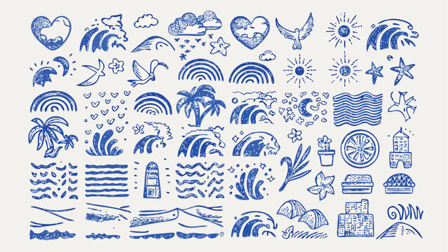 Collection of ocean themed doodles including waves hearts suns and palm trees in a blue ink style