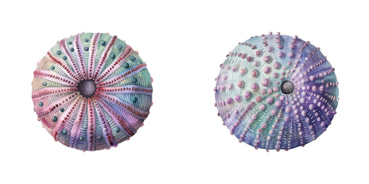 Set of six sea hedgehogs or urchin of blue, red, yellow, pink and black colors. A vector illustration of marine animals separately on a white background with a transparent shadows.