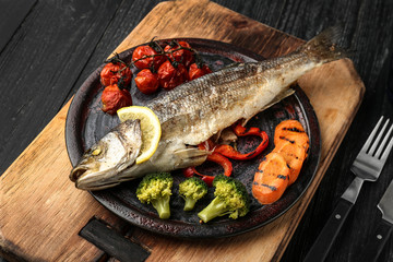 Grilled seabass fillet with arugula, lemon, tomatoes and capers. Close-up.