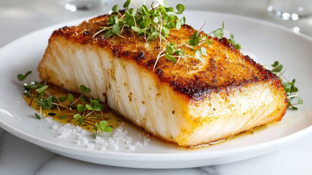 Perfectly seared seabass fillet with golden caramelized skin on white plate, garnished with microgreens and sea salt