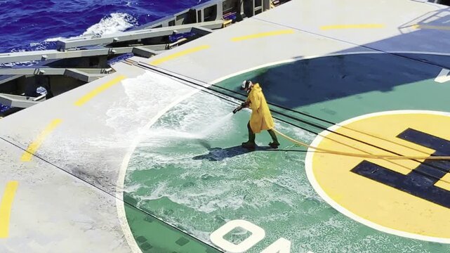Sailor washes bulk carrier washing hatch covers with fire hose after unloading — real maritime deck work. 34