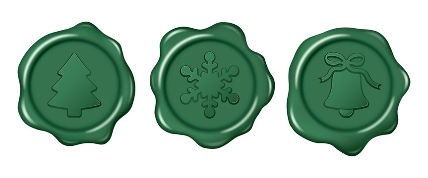 Christmas wax seal stamp. Set of green pine tree, snowflake, bell sealing wax stamps decorative elements. Elegant vintage sign mockup for invitation, cards, tags, banner, letters, calligraphy, etc.