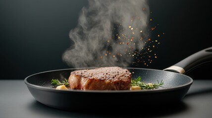 Juicy steak sizzling in a pan with aromatic herbs, creating a savory and appetizing scene.