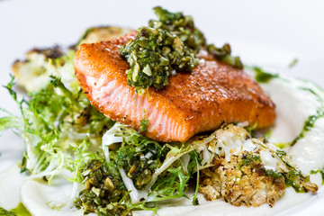 Pan seared salmon with herbs and lemon slices. Delicious home cooked meal nutritious whole food source of protein and Omega 3 fatty acid
