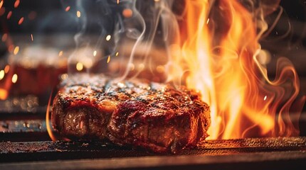 A dramatic close-up of a juicy steak being seared on a hot grill, sizzling with flames and smoke for a rich culinary mood.
