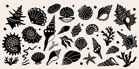 Set of hand drawn seashells drawing ink. Minimalist line art. Summer vacation design elements for trendy prints, label, menu cover. Tropical beach shells. Vector flat illustration.