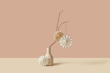 Christmas backdrop featuring holiday decorations on a white wood surface with copy space