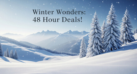 Scenic view of snowy mountain landscape with fir trees, evoking winter holiday, cold season, or outdoor adventure, perfect for seasonal promotion