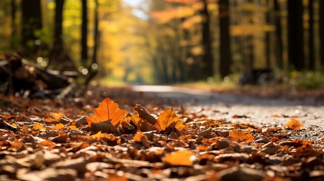 Autumn leaves gather around a roadblock in a forest, signaling seasonal change
