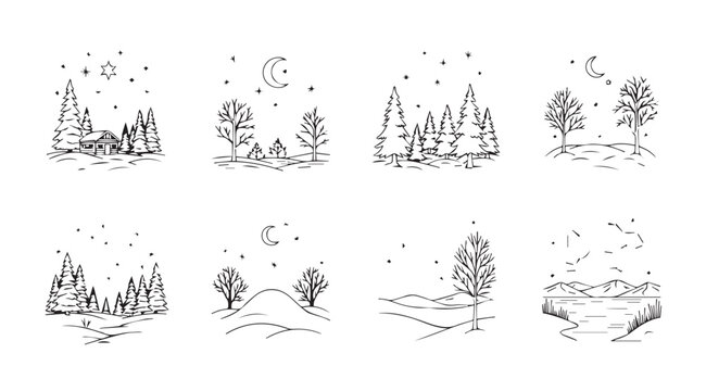 Hand drawn Christmas tree silhouettes set with fir and pine winter holiday vector