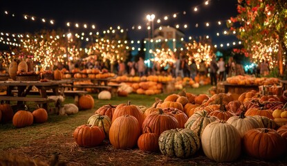 Magical autumn night at a festive pumpkin patch illuminated by enchanting fairy lights creating a warm, inviting atmosphere for seasonal celebrations