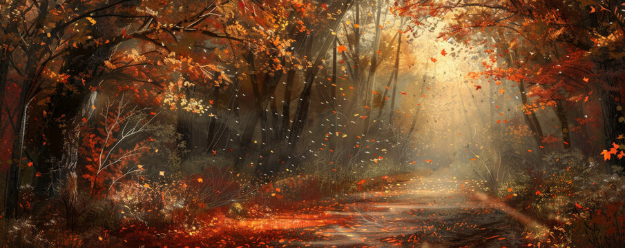 construction site in autumn with bulldozer preparing asphalt on road surrounded by vibrant fall foliage. scene captures essence of seasonal change and progress
