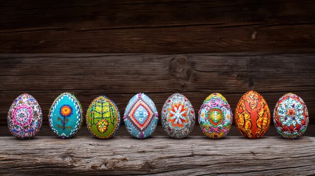 Festive Easter eggs with natural wooden texture, conveying joy and tradition, ideal for seasonal promotions and family themes.