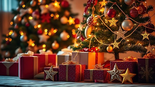 Festive holiday setup with decorated tree and gift boxes, evoking warmth and seasonal joy.