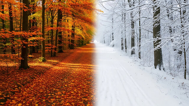 Concept of seasonal change with autumn leaves and winter snow
