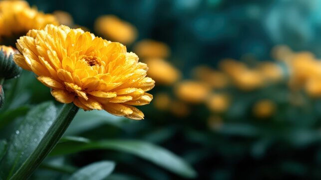 A striking close-up of a vibrant yellow flower with droplets on its petals, showcasing nature's beauty and the freshness of a morning, evoking feelings of warmth and vitality.