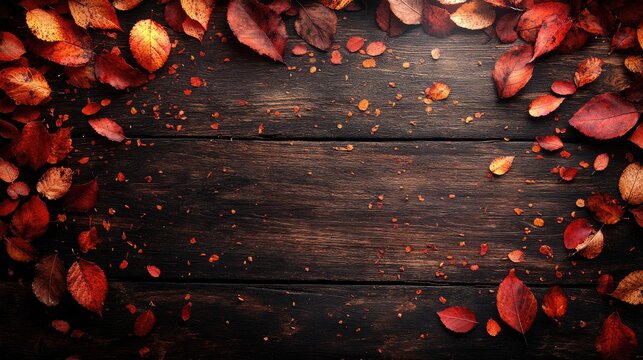 Vibrant autumn leaves scattered on rustic wooden surface, evoking seasonal warmth and nature's beauty
