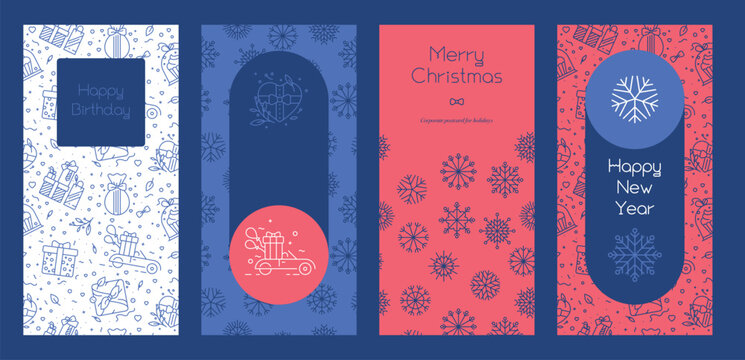 Merry Christmas and Happy Holidays cards with New Year gifts, presents, snowflakes, floral frames and backgrounds design. Modern universal artistic templates. Vector illustration in linear style