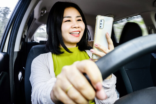 Unrecognizable pregnant woman in orange dress in car, using internet on smartphone planning her route, getting ready for trip in car. Modern expectant mother takes care of safety and wearing seatbelt