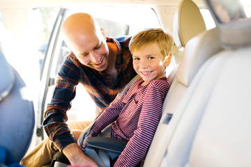 Portrait of handsome man sitting in driving seat of car and wearing seatbelt for safety