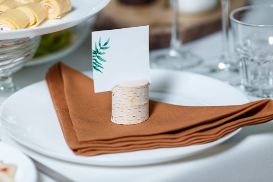 Wedding table setting with blank guest card on a dish. Rustic decor in brown tones