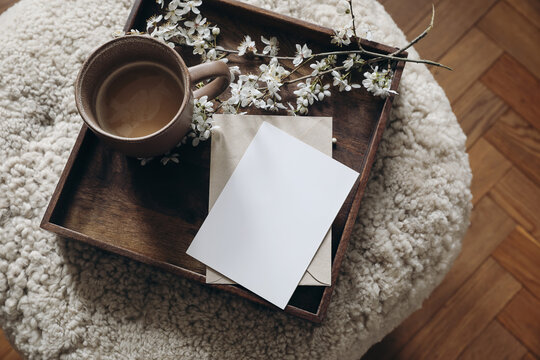 Blank mockup template of an invitation card placed on a marble surface with gold jewelry and fresh flowers – ideal for event planners, wedding designers.