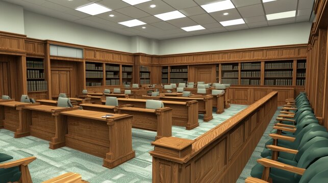 Spacious Courtroom with Wooden Furniture and Book Shelves