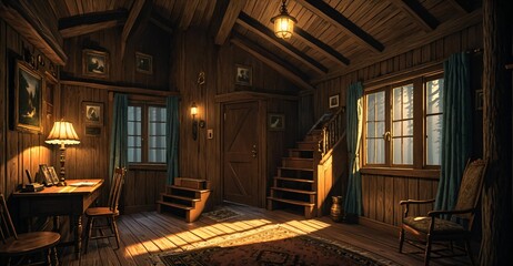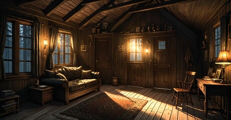 interior of modern cabin living room in secluded forest woods. furniture interior design and decor of mansion house lodge with glass window walls and wood floor roof.