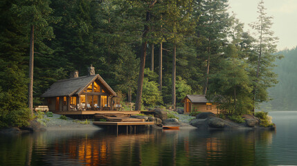 Cabin nestled by a serene lake, surrounded by autumn foliage under a pastel sunrise. Mountains fade into the horizon with mist, creating a peaceful, secluded ambiance