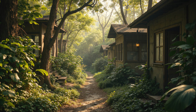 Tropical eco-lodge nestled in dense green jungle with cozy wooden cottages, palm trees, and a sunlit pathway leading to a peaceful and secluded nature retreat