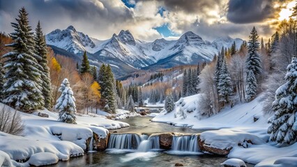 Snowy Mountain Solitude, evoking peacefulness and seclusion amidst snowy peaks, frozen waterfalls, and serene forests in Gunnison's winter wonderland, under soft overcast lighting.