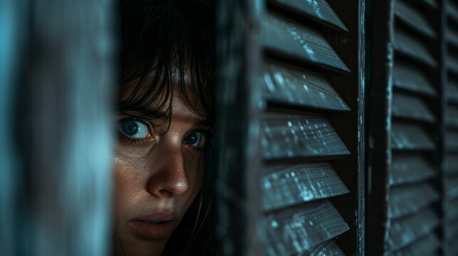 Curious eye peering through blinds with hands gripping slats in mysterious light