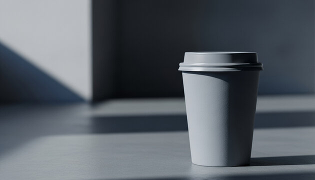 White disposable cup with secure lid placed on a flat surface where natural light and gentle shadows create a peaceful mood for minimalist drink branding visuals.