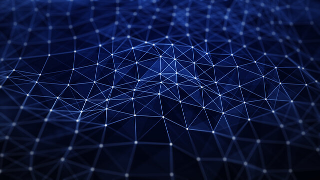 Technology concept of the interconnection of dots and lines as polygons. Dark blue abstract background.