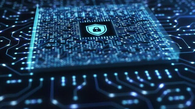 Cyber security and protection of private information and data concept. Locks on blue integrated circuit. Firewall from hacker attack