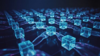 Dynamic blockchain network with glowing blue cubes for cutting-edge technology solutions and secure data transmission applications