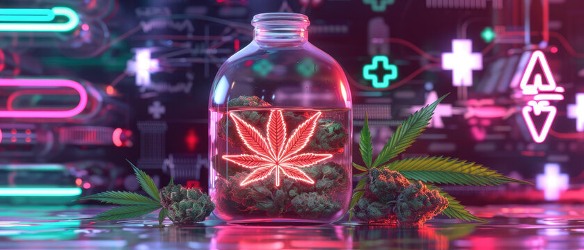 Cannabis in a sterile transparent medical bag surrounded by neon medical icons. This 3D rendering highlights futuristic and innovative medical packaging.