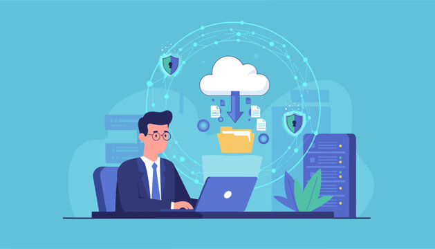 Flat illustration of man managing cybersecurity for remote work telecommuting security